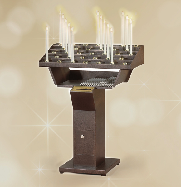 Un candeliere gestuale simula i gesti dei fedeli che tradizionalmente prendono una candela, la accendono e la inseriscono nell'apposito comparto.